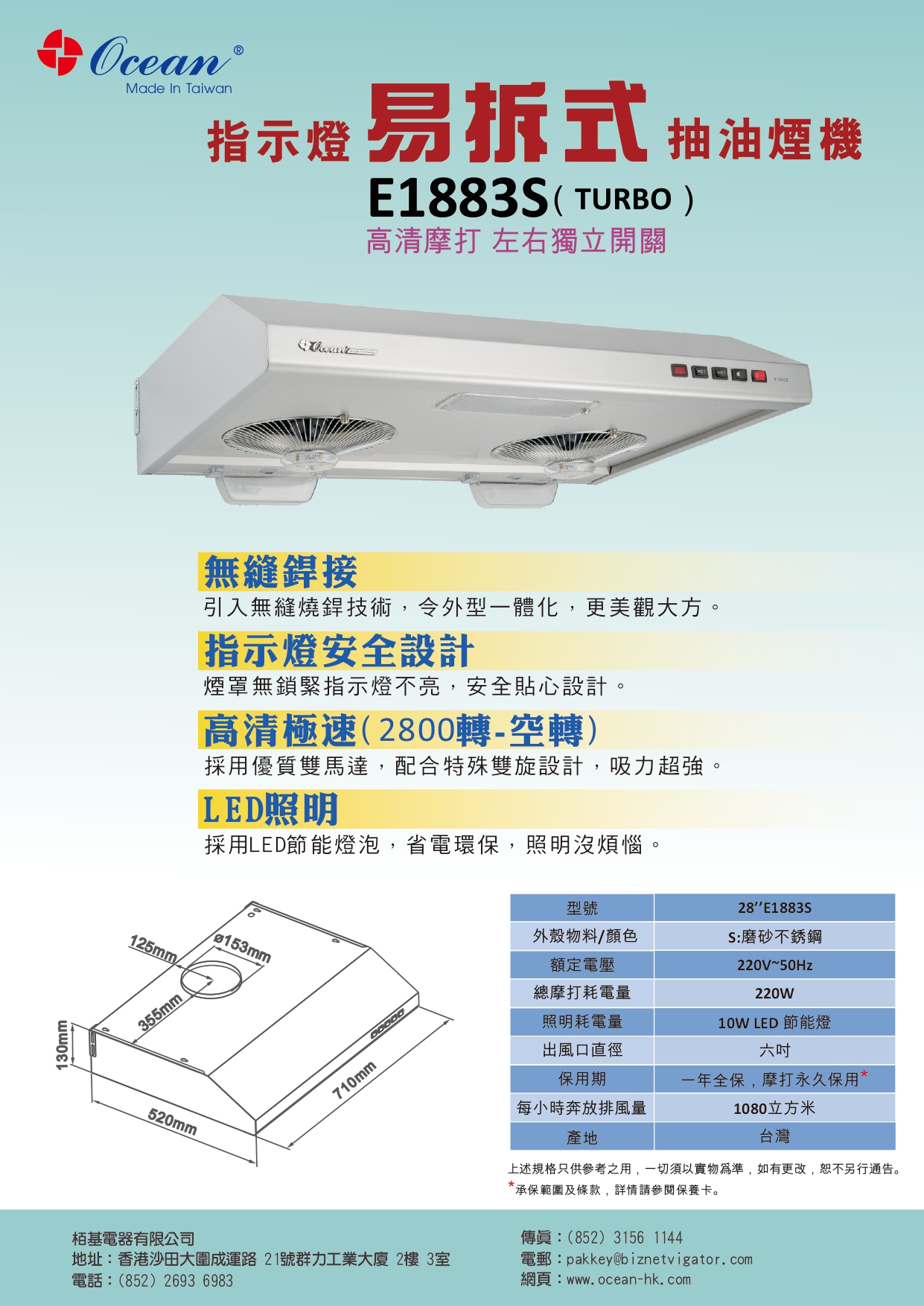 Ocean®海洋® E1883S 28” 指示燈易拆式抽油煙機 (磨砂不鏽鋼)